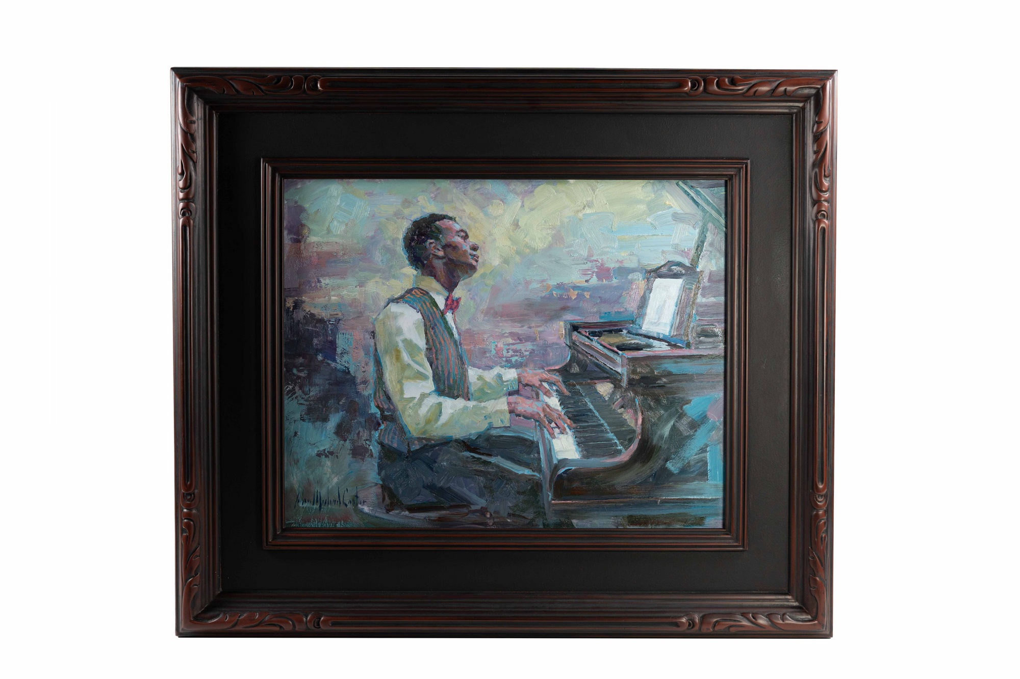 Created especially for this year’s Jubilee by artist John Michael Carter, this original 16" x 20" painting beautifully embodies the “Jubilee and Jazz” theme. The artwork portrays a jazz pianist fully immersed in his music, brought to life through bold, expressive brushstrokes and a vibrant palette of purples, blues, and greens. Presented in a richly detailed, substantial wood frame, the finished piece measures 25" x 29" and radiates both movement and emotion.